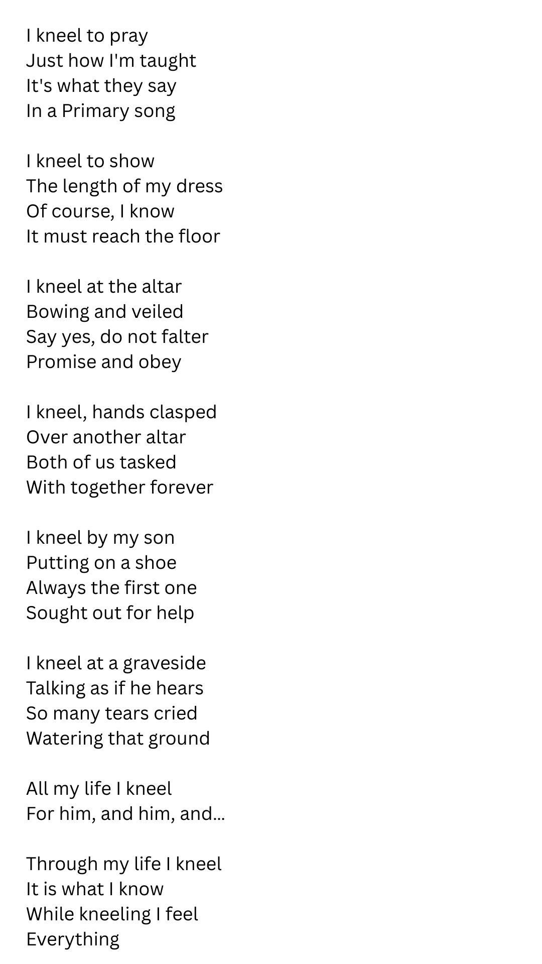 In the church, being “reverent” isn’t just about noise. It’s an outward manifestation of your relationship to the divine. The “good girls” are soft-spoken and graceful. They fold their arms and cross their legs, sing in the right key, and sit through sacrament meeting like angels carved from stone.